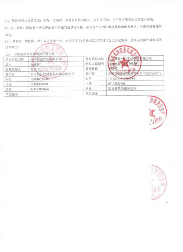 2019年10月23日友誠管業(yè)有限公司于宜昌市晟泰水電實業(yè)有限責任公司簽署了柔性承插口連接涂塑鋼管,從開始于譚總交談到來廠里考察,譚總對我們非常的信任認可,我們一如既往的做好每一個業(yè)務